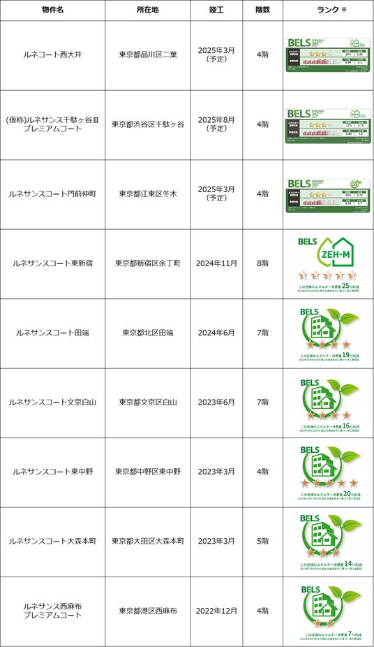 新日本建物では、「環境負荷の低減」として環境認証対応物件や省エネルギー物件の開発を推進しており、今回のBELS認証の取得は10棟目となります。