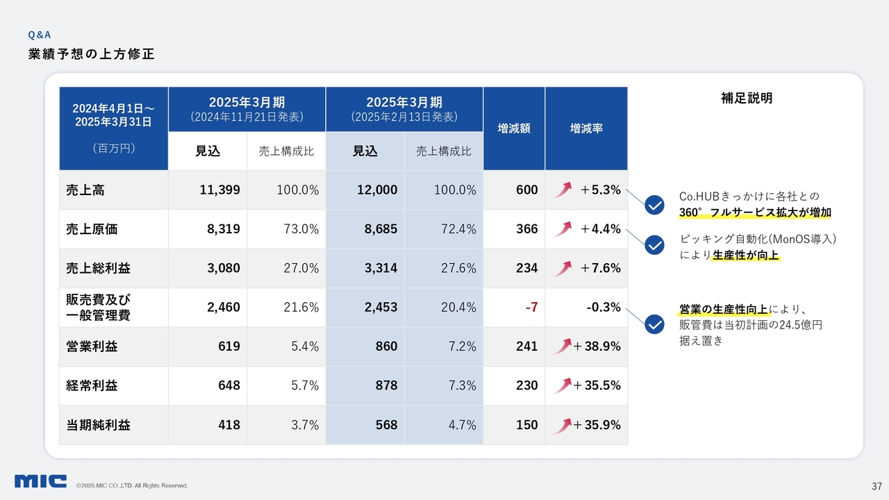 【QAあり】MIC、業績予想を上方修正 売上拡大・原価改善により経常利益は前年同期比+99.5%と約2倍に