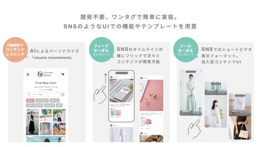 Instagram連携UGC活用機能・動画接客機能・スタッフ投稿機能に加えて、昨年2024年9月には、ビジュアルコンテンツのAIレコメンド機能、SNSのようなユーザー体験を提供できる各種テンプレートの新機能をリリース。すでに多くの企業へ導入されています。