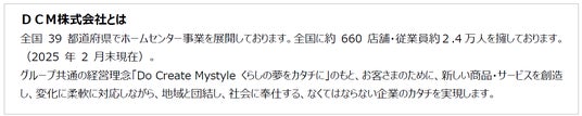 DCM豊橋曙店は、愛知県内では81店舗目、DCM全体で661店舗目の出店です。これまで地域の皆さまにご愛顧いただいた「DCM豊橋山田店」を曙町へ移転し、売場面積を約2倍に拡大しました。新店舗では、店舗でご購入いただいた木材などを使用してDIYをお楽しみいただける「みんなの工作室」を新設しています。また、園芸用品・家庭用品を中心に売場を拡大し、品揃えをさらに充実させることで地域のお客さまにより便利でお買い物がしやすい店舗に生まれ変わりました。