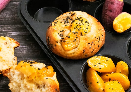 栗ダイスを練り込んだマフィン生地に鹿児島県産さつま芋を使用したスイートポテトのような味わいのクリームを包み込み、紅あずまの蜜煮をトッピングした秋のほっくりマフィンです。