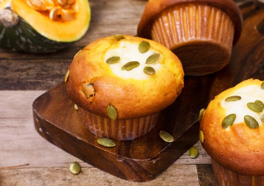 北海道えびすかぼちゃを使用したあんを練り込んだマフィン生地で、クリーミーなチーズクリームを包み込みました。さくっとしたパンプキンシードの食感が楽しい秋の人気マフィンです。