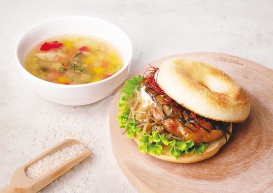米粉ベーグルの美味しさを再発見できる和素材をあわせた『米・米粉消費拡大推進プロジェクト』限定サンドイッチと塩糀を使用した優しい味わいのカラダ温まるスープのセットです。