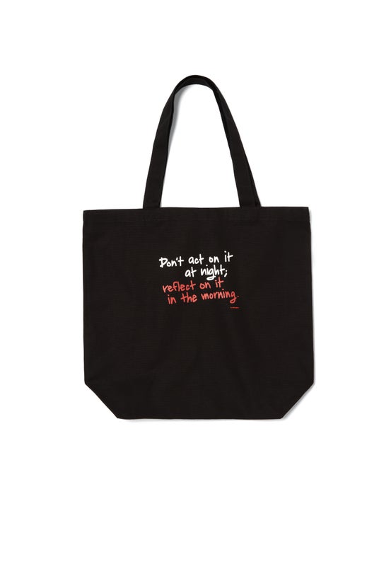 アン ミカさんの名言「夜はあかん、朝考えよう」の英訳を蓄光インクでプリントしたトートバッグは、暗い場所で見ると“Don't act on it(夜はあかん)”の文字が浮かび上がり、遊び心を感じられるアイテムです。