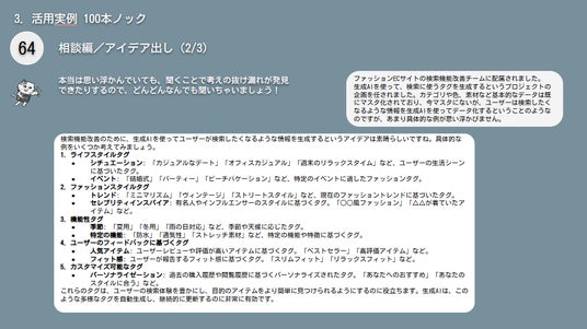 研修では、すでに生成AIを活用し成果を上げている複数部門の社員から収集・整理した使用プロンプトとその出力例を、計100件の実践的な活用パターンとしてオンライン形式で紹介・解説しました。業務への応用イメージを具体的に掴める研修内容により、受講者の生成AIに対するハードルを下げ、より自分事化し興味を持って研修に取り組める工夫をおこないました。
