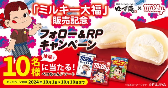 株式会社物語コーポレーション(本社:愛知県豊橋市/代表取締役社長:加藤 央之)が全国98店舗展開する『寿司・しゃぶしゃぶ ゆず庵』(以下、ゆず庵)は、期間限定「ミルキー大福」の販売を記念して、2024年10月1日(火)より、公式X(旧Twitter)で「ペコちゃんアソート」が当たるプレゼントキャンペーンを開催いたします。