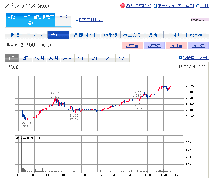 ①2月13日上場 マザーズ 証券コード:4586 メドレックス 上場来安値 2111円 7月12日現在 3190円 公募価格 1000円 → 初値 2200円 ②2月14日上場 マザーズ 証券コード:3180 ビューティガレージ 上場来安値 2710円 7月12日現在 3150円 公募価格 2300円 → 初値 4160円 ③2月14日上場 JASDAQ 証券コード:3181 買取王国 上場... ...続きを読む