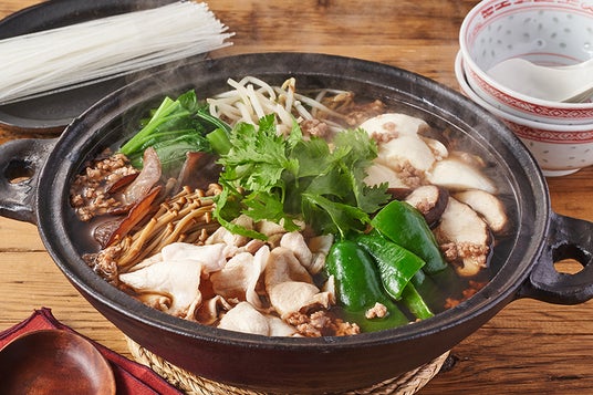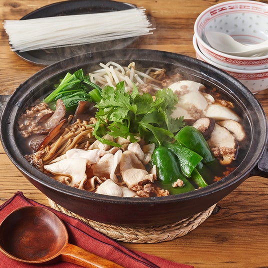 商品説明:山椒をベースに加えたスープの爽やかな香りと、立ち上る五香粉の匂いが台湾を彷彿とさせる、異なる豚肉の部位を巧みに使ったお鍋。食材をほおばった時の香りとほのかな痺れをお楽しみください。