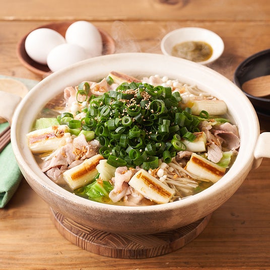 商品説明:仕上げに加えるにんにく油の香ばしさが食欲そそる!焼きねぎの甘みと、後のせ九条ねぎで香り豊かに仕上げたWねぎの旨み詰まった塩鍋。途中でグリーンチリソースで味を変えて爽快な辛みを味わったら、〆は雑炊に温泉たまごを割り入れて、まろやかな中にとろーり濃厚なおいしさを召し上がれ。