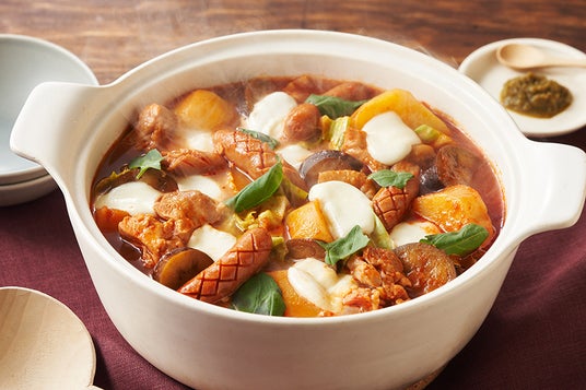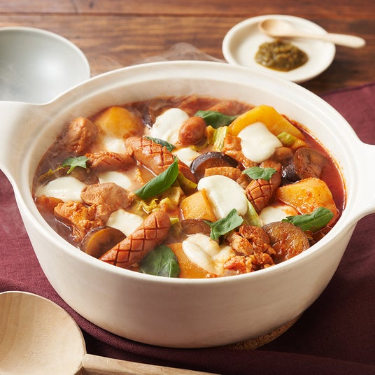商品説明:マルゲリータをお鍋で再現!にんにく、バジル、モッツァレラチーズに、Wの肉の旨みで食べごたえも◎。途中でグリーンチリソースを加えてピリッと辛くしたり、〆のリゾットやパスタまで楽しめる、おいしさ盛りだくさんのお鍋です。