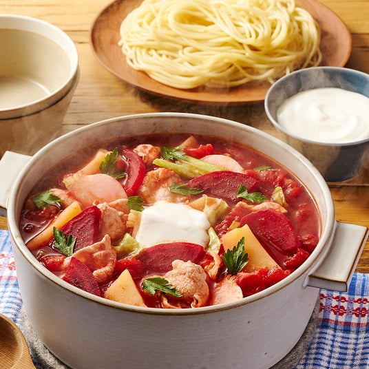 商品説明:ロシア料理のボルシチをヒントに、ホクホク野菜と豚肉をビーツ風味の鍋素で煮込む洋風鍋。後掛けのヨーグルトソースが、爽やかな酸味をプラスして飽きることなく楽しめます。敢えてスープを残して、〆のお楽しみスープパスタをお楽しみください。