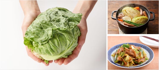 ▲「【スぺパベジ】使い切り!あめ玉キャベツ」(左)、調理イメージ:ポトフ(右上)、回鍋肉(右下)