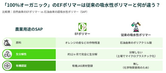 EF Polymerは高吸水性ポリマーの製造・販売を事業としています。(高吸水性ポリマーは自重の何倍ものの水を吸収でき、土壌の保水・保肥力を高め、農作物の収穫量アップや水・肥料の使用量削減が期待できるものです)製品特徴としては、農業廃棄物(バナナやオレンジの皮など)をアップサイクルした自然由来の高吸水性ポリマーを開発しています。