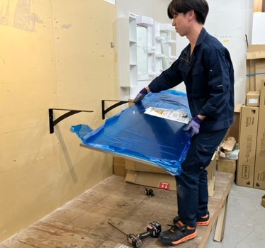 天板の重量は幅900mmタイプで約9kgと軽量なので、1名でも簡単に取り付けが可能です。