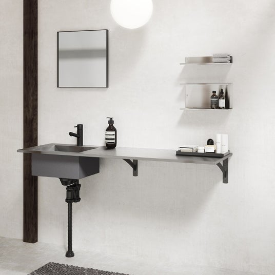 洗面水栓を組み合わせると洗面台として使用でき、加熱機器や換気扇と組み合わせるとコンパクトキッチンとして使用できます。洗面・キッチンいずれの空間で使用しても、違和感のない普遍的なデザインです。