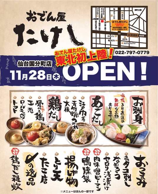 【 東北 初出店! 】 2種類の出汁で味わう “創作おでん専門店” 『おでん屋たけし 仙台国分町店』 11/28 (木) オープン!
