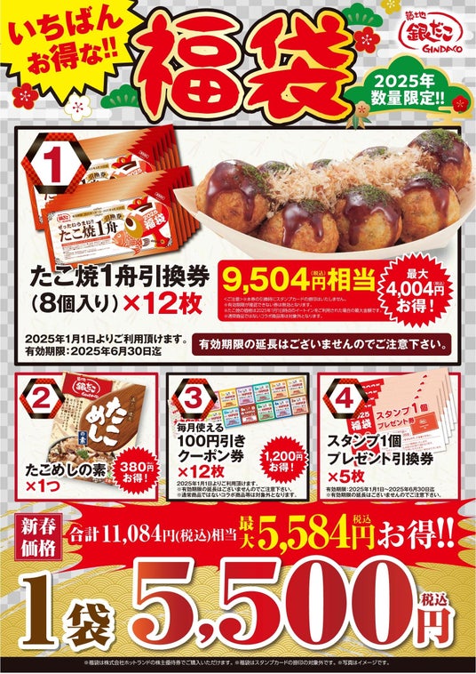 築地銀だこ https://www.gindaco.com/ を展開する株式会社ホットランド https://hotland.co.jp/(本社:東京都中央区、代表取締役社長:佐瀬守男)は、2025年1月1日元旦 (一部店舗では先行販売開始) より ※1、全国の築地銀だこ店舗及び近隣特設会場(一部店舗を除く)にて、 『ぜったいお得な!! 福袋』 を数量限定で発売いたします!