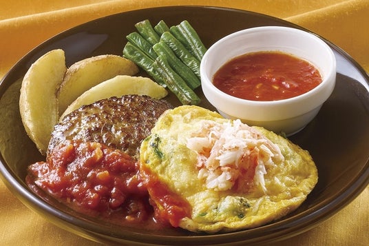 ふっくらジューシーな合い挽きハンバーグに、とろ~りたまごのオムレツを添え、ぷりぷり食感のたらば蟹をトッピングした逸品。