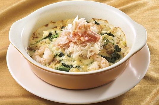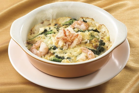 たらば蟹と小海老、ほうれん草、クリーミーなホワイトソースがマッチした熱々のご褒美ドリア。