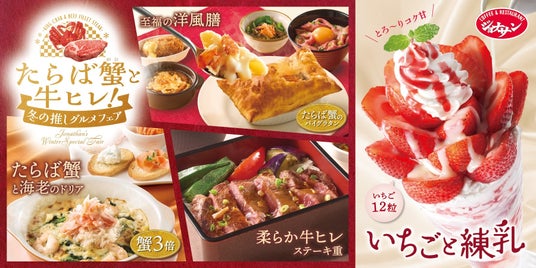 株式会社すかいらーくレストランツ(本社・東京都武蔵野市、代表取締役社長 中島 尚志)が運営するジョナサンでは、2024年12月12日(木)より、「たらば蟹と牛ヒレ~冬の推しグルメフェア~」と「いちごと練乳のスイーツ」を期間限定で販売いたします。
