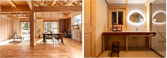 (左)畳コーナーと薪ストーブのあるリビングダイニング。間仕切りが無く開放的。冬は薪ストーブだけで家中まるごと温まります。(右)サニタリールームは個性的、スケルトンの浴室は海外のラグジュアリーホテルみたい!