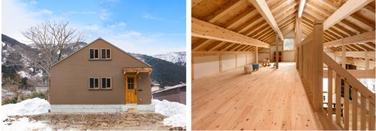 (左)御堂山の麓の三角屋根の外観。素晴らしいロケーションで、雪景色だけでなく四季折々の表情が楽しめます。(右)何に使うか夢が広がる屋根裏空間。