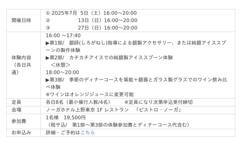 野村不動産ホテルズ株式会社(本社:東京都新宿区/代表取締役社長:石井康裕、以下「当社」)が運営する「ノーガホテル 上野 東京(以下「ノーガホテル上野」)」は、ブランドコンセプト『地域との深いつながりから生まれる素敵な経験』を体現するイベントとして、江戸時代から伝わる東京の伝統工芸「東京銀器」の製造販売を行う有限会社日伸貴金属(以下「日伸貴金属」)の協力のもと、ディナー付きの銀製アクセサリー製作のワークショップを開催いたします。