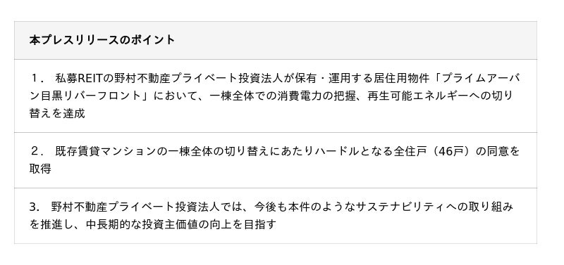 このたび、NPRが保有する居住用物件「プライムアーバン目黒リバーフロント」(以下「本物件」といいます。)において、レジル株式会社が提供する既存賃貸マンションの一括受電化サービスを活用し、専用部を含む一棟全体の消費電力の把握、再生可能エネルギー(実質再生可能エネルギーを含む。以下「再エネ」)への切り替えを達成しましたので、お知らせいたします。