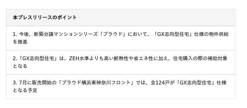 また本物件以降の計画においても、今年度中に着工する4物件で全戸「GX志向型住宅」仕様の物件を予定しており、今後も当社は、環境性能の高い住まいが促進される市場作りを後押しし、サステナブルな社会への貢献を目指すとともに、お客様へ高い快適性や経済的メリットを確保した住まいを提供してまいります。
