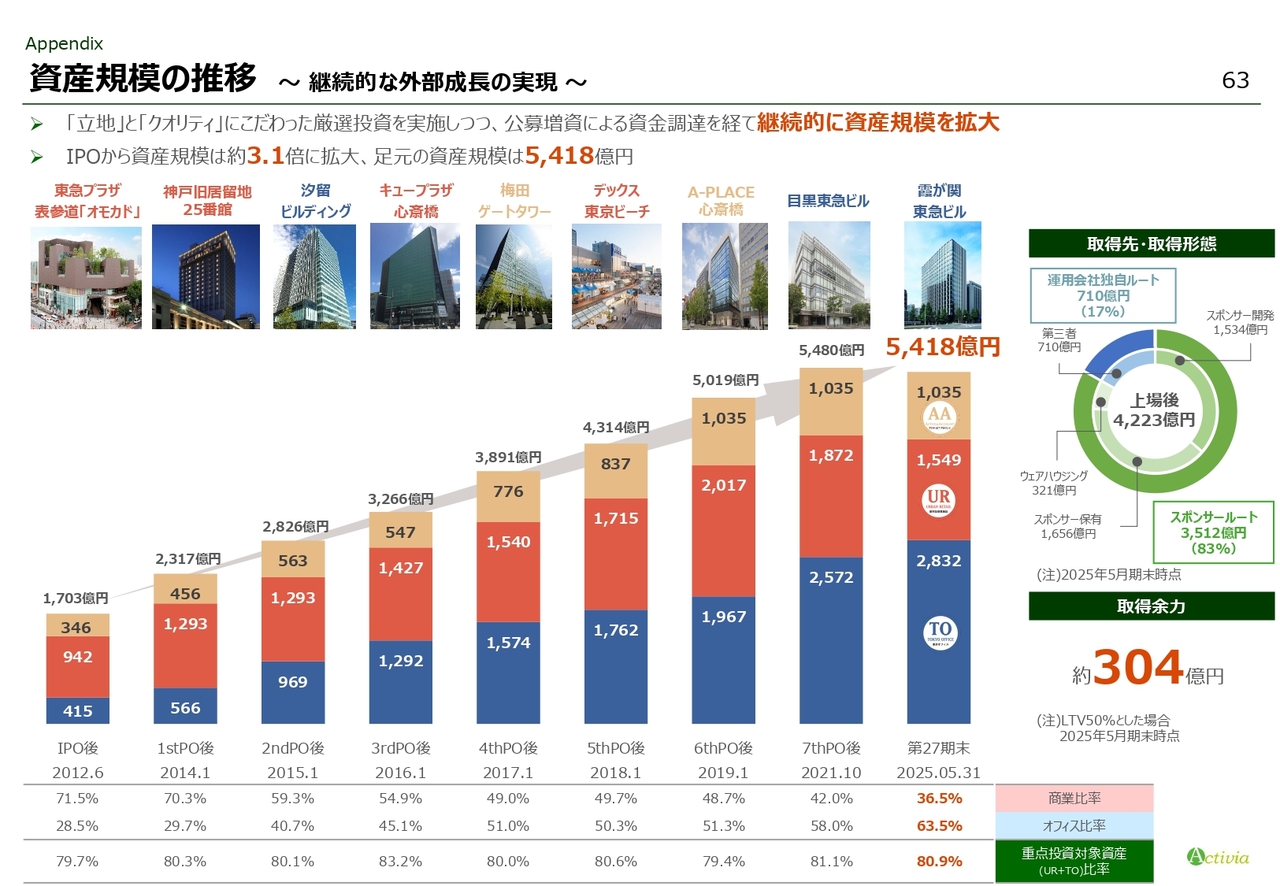 また、物件を取得した後にもしっかり賃料成長させていくという観点では、まずはグループの運営基盤がしっかり整備されたエリアにフォーカスしていきたいと考えています。そのため、グループとしては一番強いエリアである広域渋谷圏や、拠点のある大阪、札幌あたりのオフィス商業にフォーカスしています。