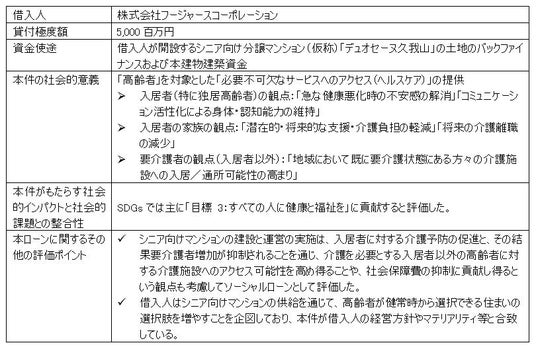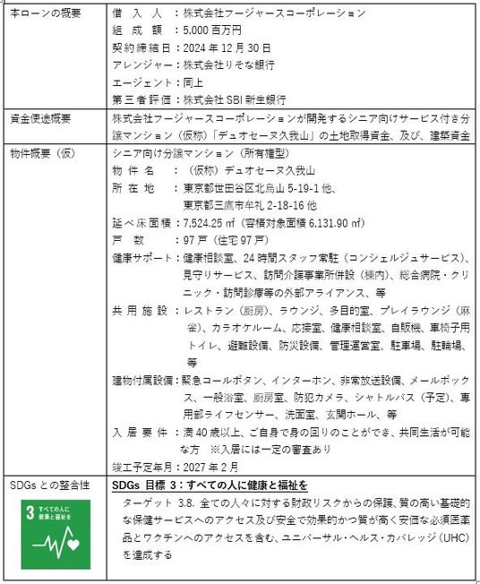 本ローンは、株式会社フージャースコーポレーションが開発する東京都世田谷区北烏山・東京都三鷹市牟礼に位置するシニア向け分譲マンション(仮称)「デュオセーヌ久我山」を対象としたものであり、株式会社りそな銀行がアレンジャーとなり、組成しました。シニア向け分譲マンション「デュオセーヌ」シリーズは、昨今の急速な高齢化に伴い、介護を必要とする高齢者が増え、介護施設の不足・社会保険財政の悪化など様々な社会課題に直面していることに対し、健常なシニア世代が心身ともに健康でより長く暮らせる商品・サービスを提供することで、「欲しかった暮らし」を実現し、超高齢社会の課題解決に貢献したいという想いから、開発を行ったものです。「住むことで健康になるマンション」をコンセプトに、健康寿命の延伸を考慮して設計され、通常の分譲マンションには無い、医療・介護・見守り・食事等のサービス(外部連携含む)を附帯する一方、賃貸借契約のサービス付き高齢者向け住宅(サ高住)と異なり、所有権であることから購入者が資産価値を有するという特徴があります。