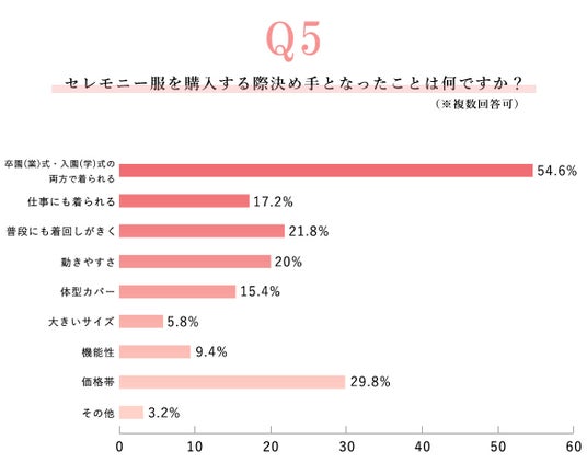 購入の決め手は「着回しのしやすさ」購入の決め手となった最も多い理由として「卒園(業)式・入園(学)式の両方で着られる」、続いて「価格帯」、「普段にも着回しがきく」という結果になりました。また、セレモニー用に留まらず、普段や仕事着として着回しすることを念頭に購入している人も一定数いることがわかりました。
