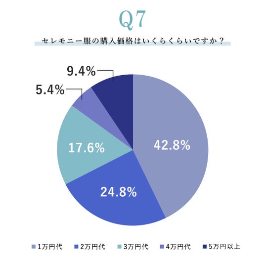 今どきセレモニー服は「1万円代」が主流セレモニー服の購入価格においては「1万円代」と回答した人が最も多く、続いて「2万円代」、「3万円代」という結果になり、4万円以上の人は2割未満でした。