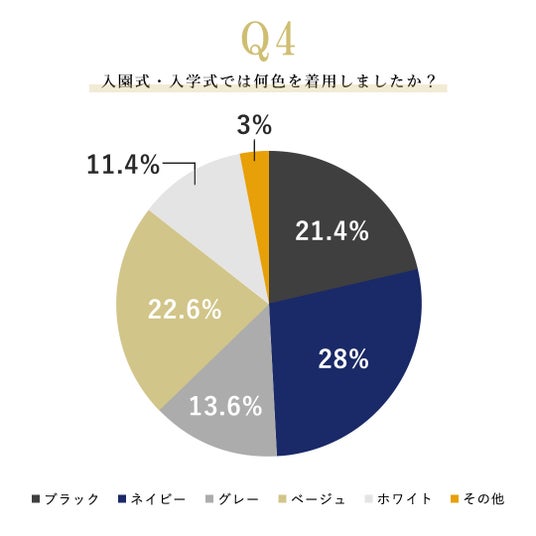 入園式・入学式では「ネイビー」を着用した人が最も多く、続いて「ベージュ」、「ブラック」という結果になりました。ダーク系が7割以上だった卒園式・卒業式に比べ、「祝いの式」でもある入園式・入学式では約5割がベージュ、グレー、ホワイトと明るい色を選ぶ人が多いことがわかりました。