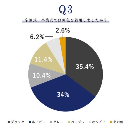 卒園(業)式は暗め・入園(学)式は明るめカラー卒園式・卒業式で着用した色で最も多かったのが「ブラック」、続いて「ネイビー」という結果になりました。卒園式・卒業式ではハレの日と呼ばれるものの、お別れの式という意味でもダークカラーを着用する人が全体の7割以上となりました。