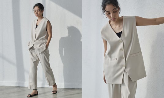 今季から新登場のセットアップ。微光沢の表面感できれいめな印象を保ちながら、ジレにややゆとりを持たせることで今時なバランスに。オン、オフ着まわせるfor/cこだわりの一着です。