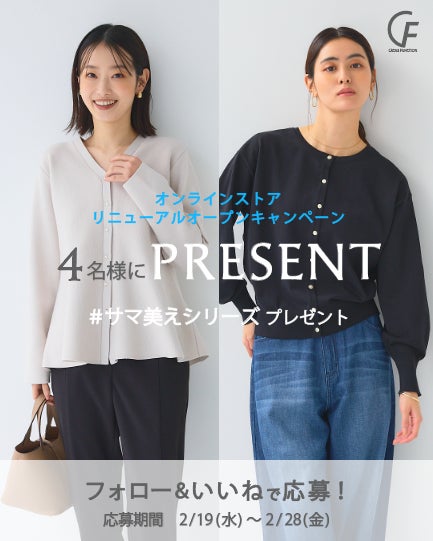 ■リニューアルオープン記念特典2.「プレゼントキャンペーン」実施中リニューアルオープンを記念し、日ごろの感謝を込めて「春のサマ美えニット」を対象としたプレゼントキャンペーンを開催いたします。ハレの日、学校行事、お仕事シーンにぴったりな美しいシルエットにこだわったニットです。パールボタンがアクセントになった「サマ美えマシュマロミラノAラインペプラムニット《洗える・毛玉になりにくい》」袖タックがアクセントになった「サマ美え袖タッククルーネックニットジャケット《洗える・毛玉になりにくい》」を計4名様にプレゼントいたします。