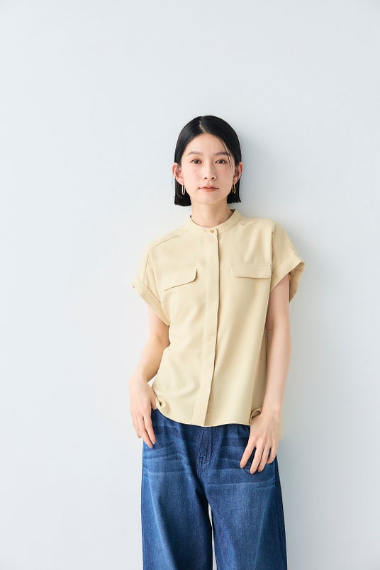 《シワになりにくい》サマナチュラ リネンライクバンドカラーブラウス・price:¥2,970(tax in)