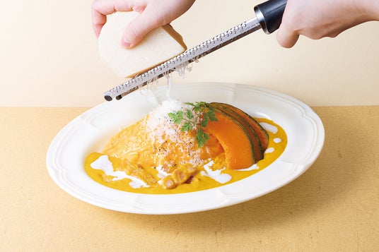 パンプキンクリームとふわふわの粉雪チーズをまとった秋限定のオムライス。