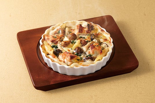 栗・きのこ・ローストチキンがごろごろ入った、秋を存分に味わうマカロニグラタン。