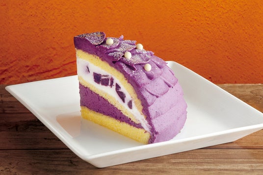 沖縄県久米島で育った自然の美味しさが詰まった紅芋を色鮮やかなクリームに仕立て、カットした紅芋を合わせたクリームと重ねました。仕上げに紅芋クリームをたっぷりと絞り、素材の良さを活かしたケーキに仕上げています。