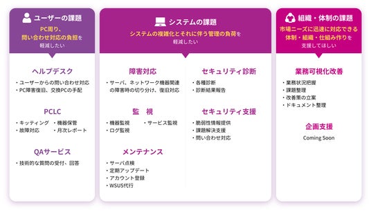 定常業務からセキュリティ対策、業務可視化まで、業務の課題を広範囲にサポートします。ユーザーの問い合わせ対応や障害対応、監視、メンテナンス、業務可視化の支援まで、あらゆる情シスの運用業務を包括的に支援します。