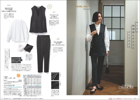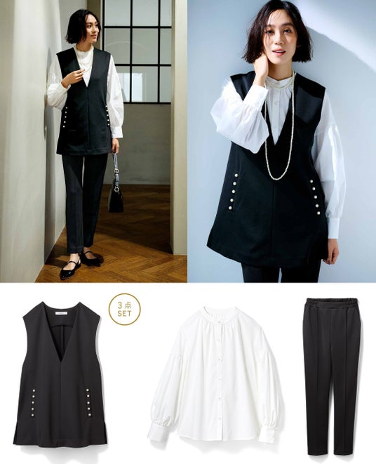 体形カバーができるプルオーバータイプのロングジレを中心にした3点セットです。トレンド感のあるセレモニースタイルが簡単に決まり、それぞれ単体で仕事やカジュアルコーデにも重宝します。