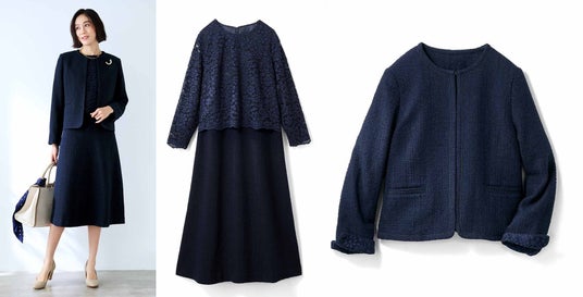 一枚は持っておきたいノーカラージャケットとレースワンピースのセットです。女性らしいシルエットのジャケットは単品でも使いやすく、ワンピースは袖の透け感が上品で、一枚でも華やかに着映えします。