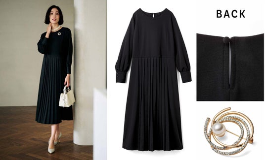 ブローチで華やぎ自在、大人が頼れるブラックワンピ