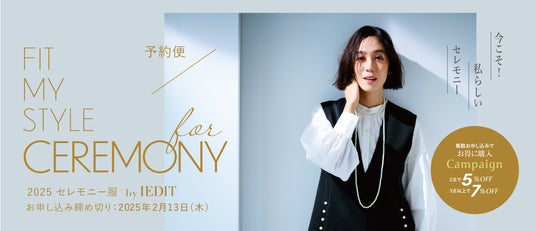 フェリシモが展開するファッションブランド「IEDIT[イディット]」は、セレモニーアイテムを発表、12月20日よりウェブ販売を行っています。新作は、永遠の定番ネイビーの「繊細レースが上品な正統派さんのためのワンピースセット」や、トレンドのジレを主役にした「パールで好印象に着映えする こなれ3点セット」、ハレの日もその後も活躍する「コーデに迷わず全シーン活躍! 着まわし自在な4点セット〈ブラック〉」などです。新作はウェブ特集ページや、デジタルカタログでチェックできます。併せて、2点予約申し込みで5%OFF、3点以上の予約申し込みで7%OFFになるキャンペーンも開催しています。