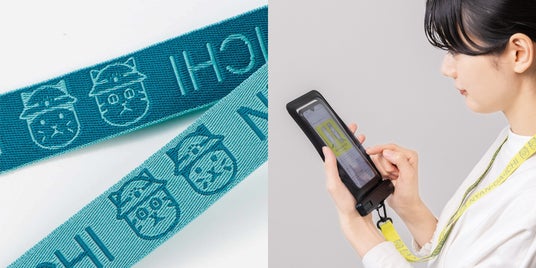 高級感のある織りのストラップです。にゃんがいちのロゴと、“いつもくん”と“もしもくん”のキュートなお顔が並びます。ふだんはケースの上から操作OKなスマホケースとして活躍します。