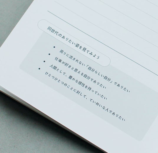 1年間の経験や成長を整理したうえで、2年目の目標を描けるノートで、ゆっくり自分と向き合う時間を。