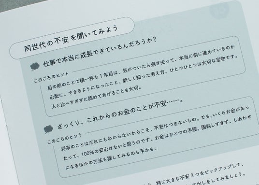 考えることがすこし難しそうな質問には、「同世代の声」を掲載。「このごろ(R)」に寄せられるお悩みやフェリシモの若手社員の声を集め、共感できるリアルな内容になりました。