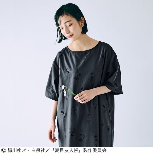 上品な暗めのグレーに、線画のニャンコ先生があしらわれた総柄ワンピースです。